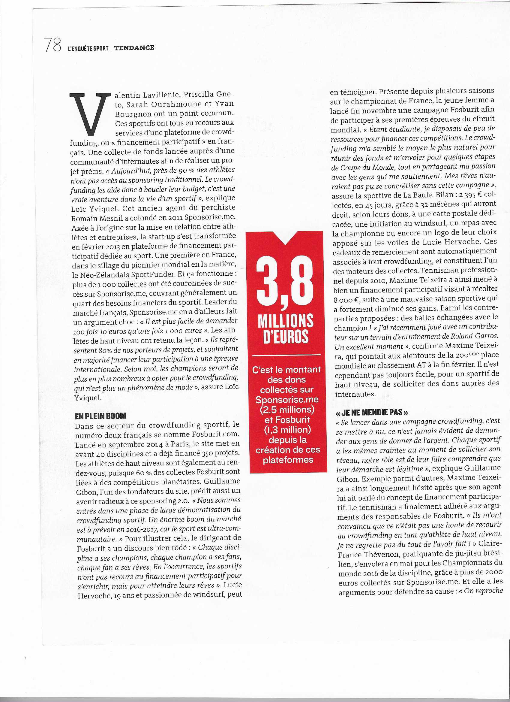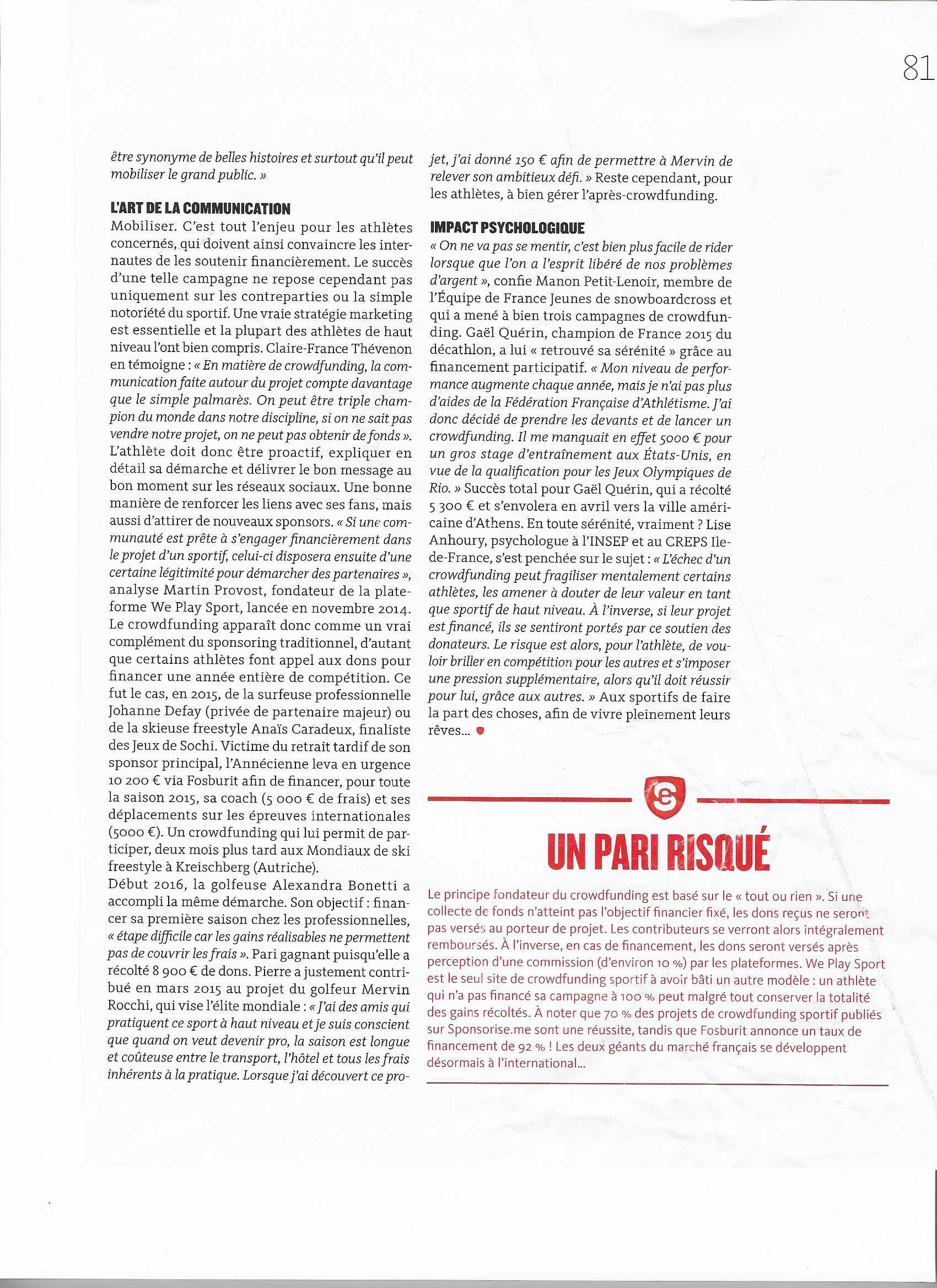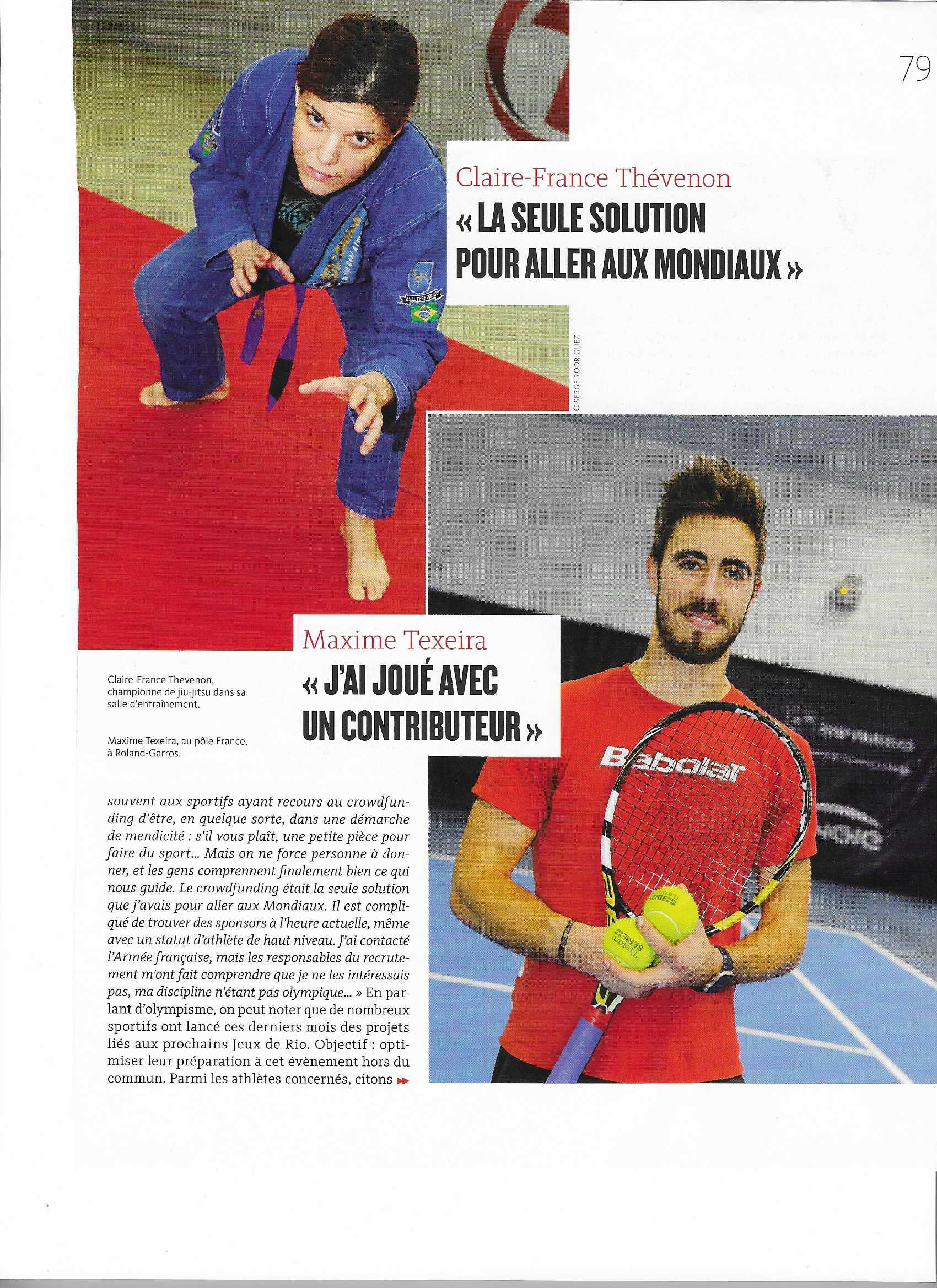 Voici la petite introduction de l’article, que je n’ai pas scannée : « Par manque de budget, de nombreux athlètes de haut niveau se tournent aujourd’hui vers leurs fans pour lever des fonds. C’est le principe du « crowdfunding », ou financement participatif. Décryptage d’un phénomène qui bouleverse le sport français. «