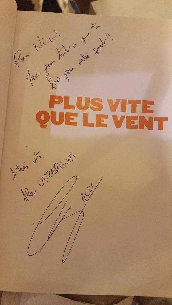 Il s’avérait que ce 5 décembre était le jour de mes 33 ans, et Jeff a discrètement demandé à Alex Caizergues s’il pouvait me dédicacer son ouvrage « Plus vite que le vent » (Les Arènes).