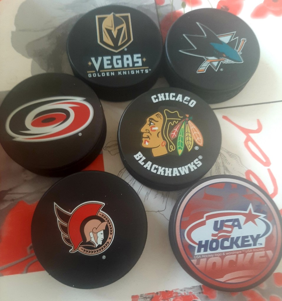 Si je possède une centaine de bibliographies liées au sport dans ma bibliothèque, j’ai également développé au fil des années une petite collection de palets (ou « pucks ») !
