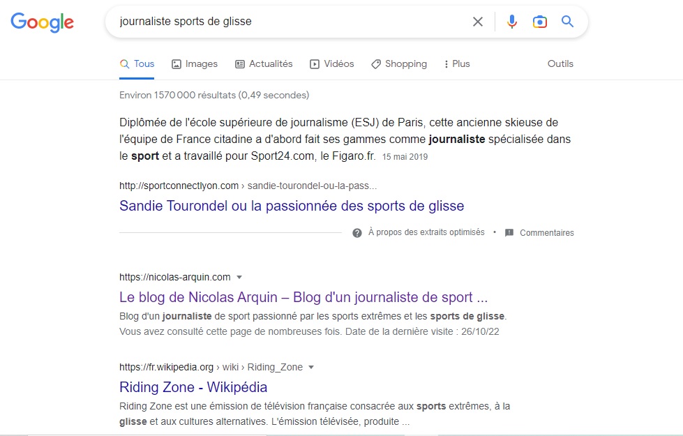 Idem si l’on tape « Journaliste sports de glisse », je sors 2e via le blog (devant le Wikipedia de l’emblématique émission Riding Zone) et 5e avec mon compte Linkedin !