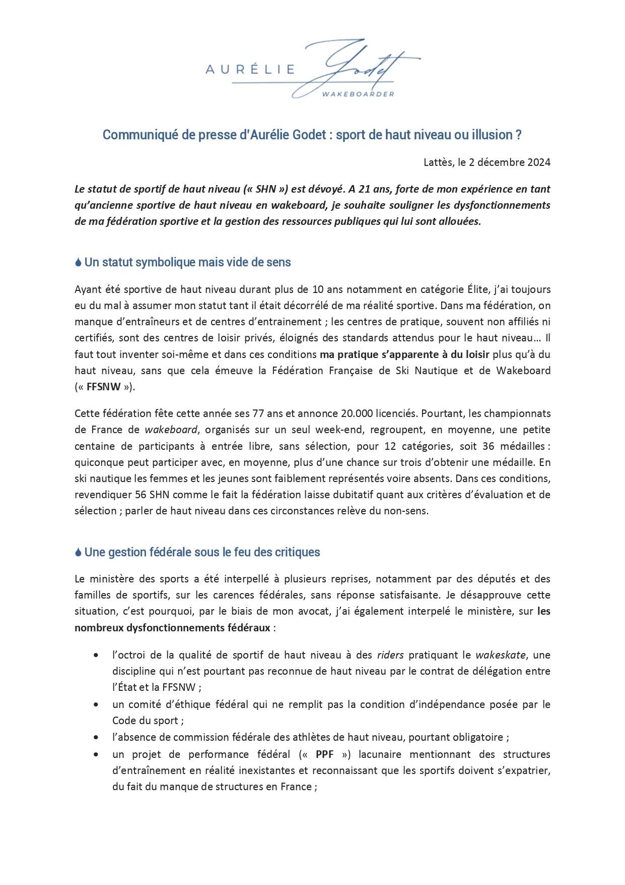 Conseillée par Me Alban Bennacer, Aurélie Godet a d’ailleurs saisi l’Agence Nationale du Sport. Retrouvez ci-dessous le communiqué de presse que l’athlète a publié le 2 décembre.