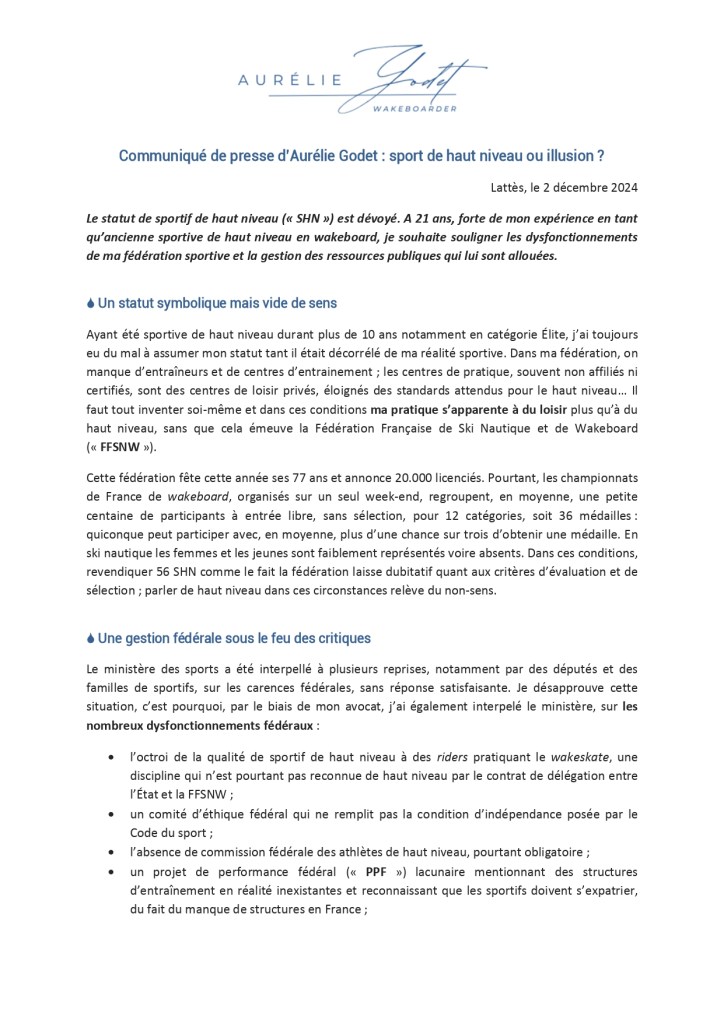 Ancienne sportive de haut niveau en wakeboard, Aurélie Godet (21 ans) a poussé début décembre un coup de gueule contre la Fédération Française de Ski Nautique et de Wakeboard (FFSNW), relayé notamment par Unleashed. L’athlète pointe du doigt un manque de structures et d’encadrement adaptés, un décalage entre la qualité de sportif de haut niveau et la réalité de l’accompagnement vers la performance, la gestion des ressources publiques allouées ainsi que plusieurs dysfonctionnements fédéraux.