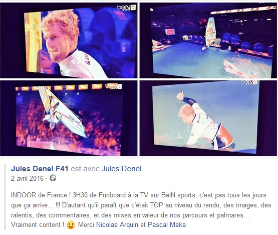 Les 1er et 2 avril 2016, la chaîne de télévision bein Sports avait ainsi retransmis sur l’un de ses canaux l’Indoor de France 2016, show de windsurf en indoor organisé par Fred Beauchêne.