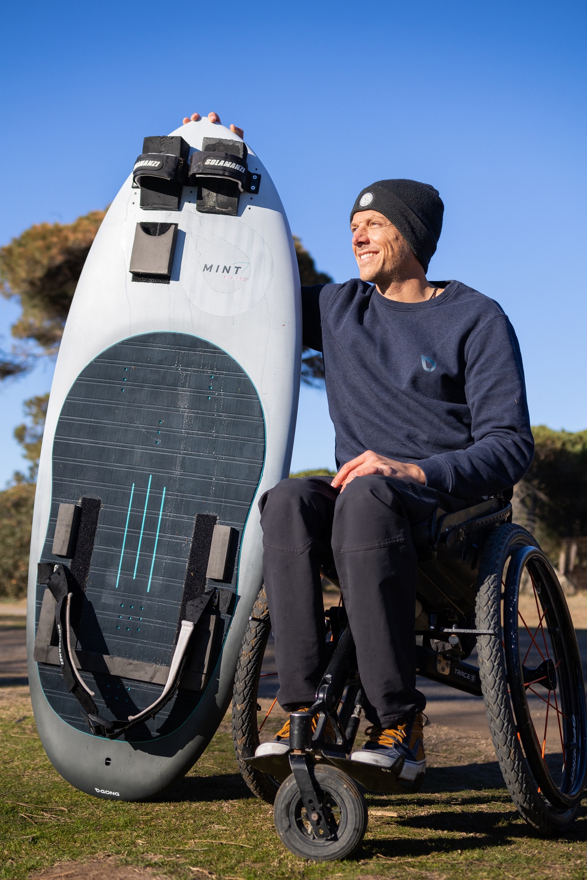 – Tu es également pionnier du para wingfoil, tu as d’ailleurs adapté ta planche de wing à ton handicap. De quelle manière arrives-tu à pratiquer ce sport ?
