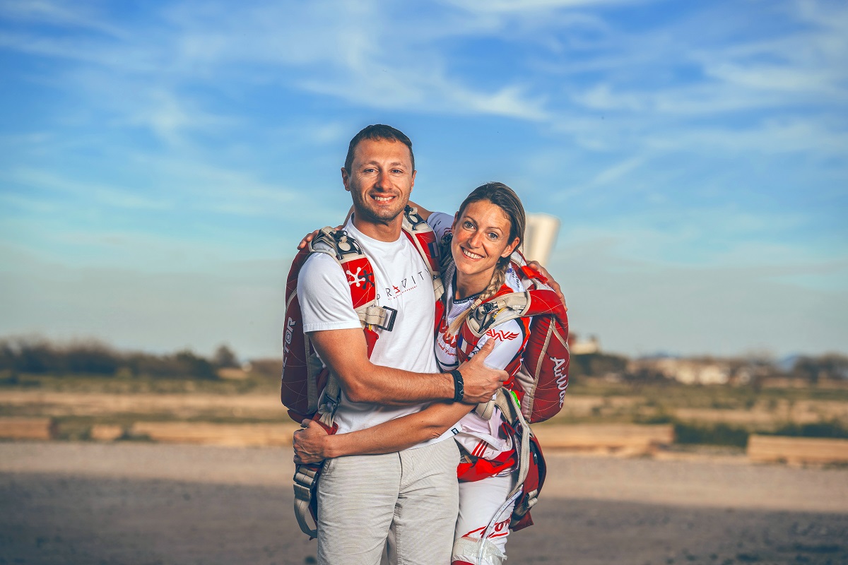 Greg : Je suis né à Saint-Etienne, et j’ai eu toutes sortes de transitions dans ma vie. J’ai commencé en tant qu’éducateur sportif, j’ai été sauveteur en mer, marin puis capitaine dans la marine. Je suis ensuite entré en équipe de France de parachutisme, et j’ai réalisé avec Karine ce long parcours de 10 années d’équipe de France. J’ai gagné une coupe du monde en 2012, je suis devenu champion du monde de parachutisme en 2018, et je détiens 10 titres nationaux et 10 records mondiaux.