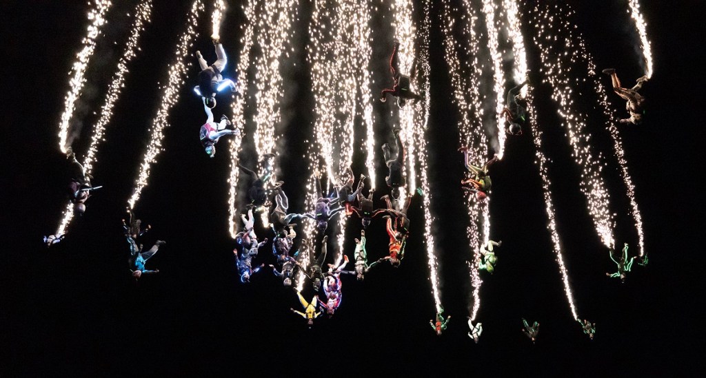 L’ambiance était irréelle, nous étions dans le noir absolu pendant toute la montée en avion. Nous n’avions le droit de mettre en route nos combinaisons que quatre minutes avant le saut. L’ambiance changeait alors complètement, en mode disco/daft punk, c’était très lumineux ! A 2 minutes du saut, nous nous levions tous et vérifions que les détonateurs soient prêts. C’est seulement au moment où nous franchissions la porte et débutions la chute libre que nous avions le droit de mettre en route nos systèmes de pyrotechnie. Il aurait évidemment été très dangereux qu’un système se mette en route dans l’avion avec l’oxygène pur qui s’échappait de nos systèmes de respiration.