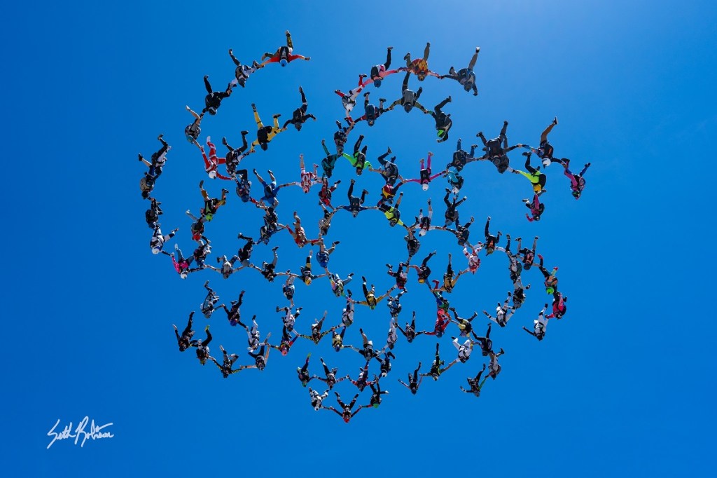 Greg : Nous nous rejoignons sur 6 jours, avec un budget global de 20 sauts, ce qui laisse de la marge. On fait exprès de se rejoindre à un moment de l’année, et à un endroit, où il n’y a pas trop de risques de mauvaise météo. Les records tombent généralement entre le 12e et le 14e saut. S’ils tombent vers la fin, c’est que la stratégie n’était pas bonne. Mais maintenant que nous avons vécu cette expérience de réussite du nouveau record d’état de Californie je suis beaucoup plus optimiste. En effet, le 23 mai à Skydive Perris, nous avons réussi une formation à 103 parachutistes, battant très largement la précédente formation à 80 établie en 2017. Une toute nouvelle technique de construction et une nouvelle forme ont été utilisées. Le résultat est révolutionnaire ! Nous avons failli réussir le record au 1er saut !
