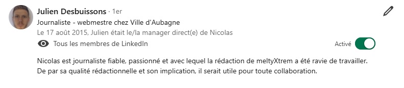 Ma première recommandation, obtenue le 17 août 2015 dans la foulée de mon expérience avec le superbe média meltyXtrem, démontre pourtant que j’ai dépassé les 10 années de présence ici.