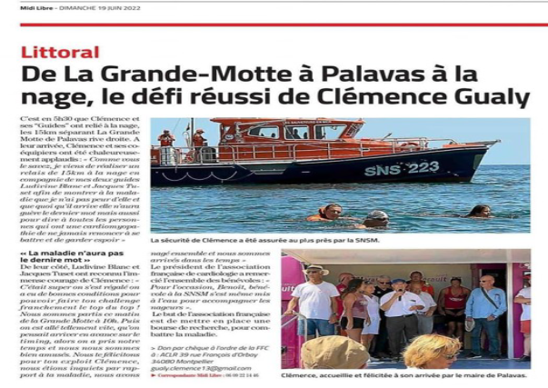 Le 18 juin 2022, ce fut un appel à la résistance, au combat, et qui restera à jamais gravé dans ma mémoire. Sous un ciel bleu ensoleillé -il faisait ce jour là 40°C – je suis devenue aux cotés de l’Association de Cardiologie Languedoc-Roussillon, la première femme au monde atteinte d’une cardiomyopathie hypertrophique très sévère à avoir nagé 5km en pleine mer, ce qui équivaut à un «semi-marathon de course à pieds ».