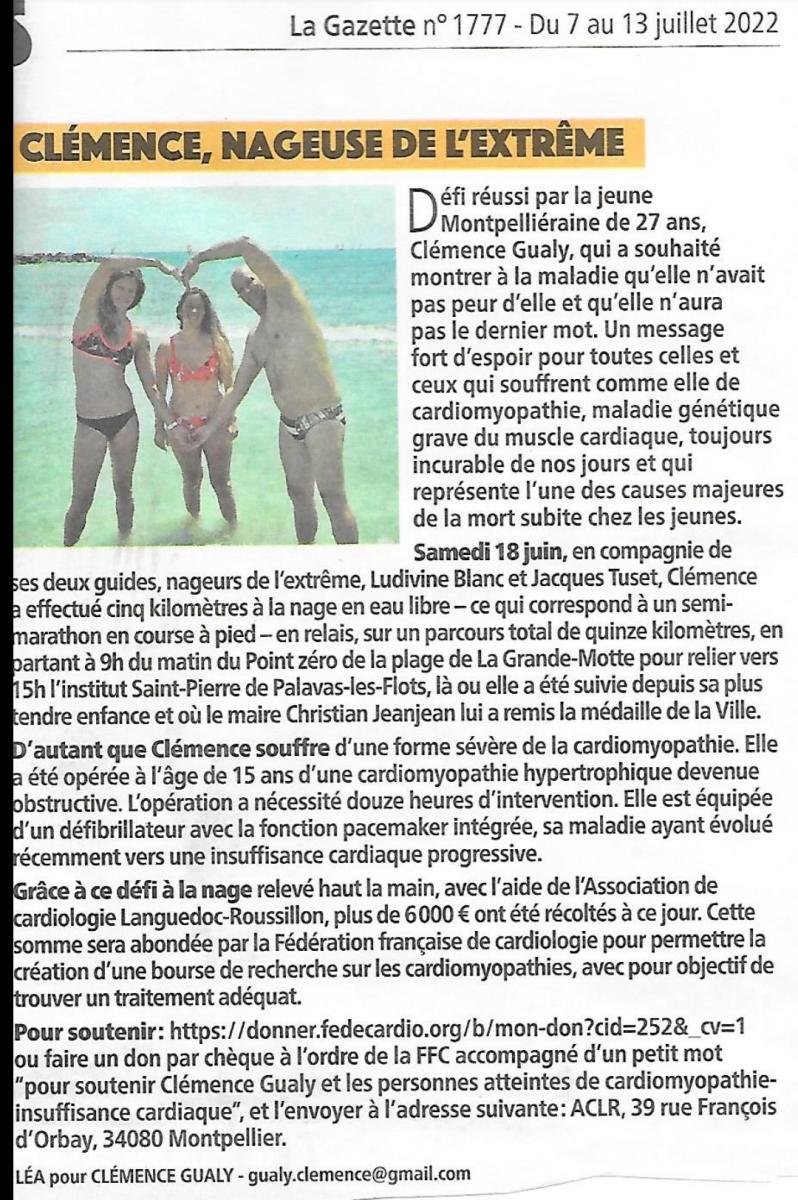 Agée de 30 ans, l’Héraultaise Clémence Gualy a un parcours hors normes. Atteinte d’une maladie génétique évolutive et incurable, la cardiomyopathie hypertrophique obstructive, la jeune femme s’est lancée ces dernières années dans des défis à la nage. En repoussant ses limites, Clémence Gualy entend ainsi montrer que la maladie n’aura pas le dernier mot.